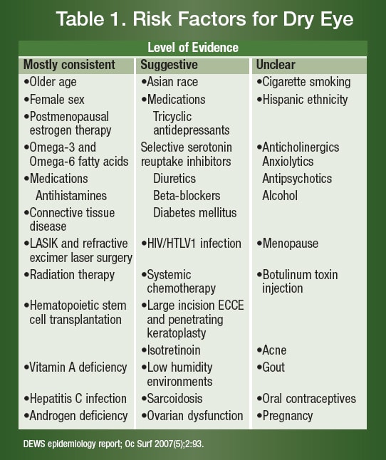 We also need to evaluate and identify the influential factors of dry eye that affect our patients. Is the patient in front of a computer all day? Is he using antihistamines or other medications which can cause dry eye? How much alcohol does he consume? Does he live in humid or arid conditions? Is he sitting near air conditioning or heating vents for much of the day? Is he surrounded by pollution or smog? These questions will help us identify the modifiable risk factors and suggest environmental or habitual changes that can be made to improve the patient's dry eye symptoms. These changes can, and in many cases do, work in conjunction with the prescribed course of treatment (Table 1).4,5