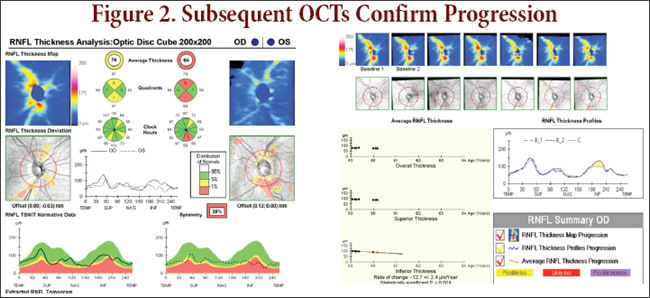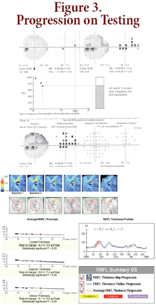 • Glaucomatous changes in left eye and suspicious changes in right eye