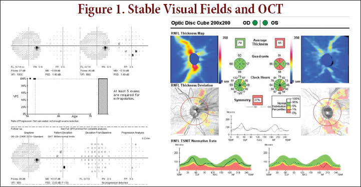 • Treated left eye with travoprost with reduction of IOP to 15 mm Hg; right eye observed