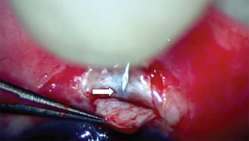 Dr. Kahook offers the following advice for implanting the Express Glaucoma Filtration Device. 1. After creating the scleral flap, use a 27-gauge needle to make the sclerostomy tunnel for insertion of the Express. I prefer this size needle because it provides a tighter fit around the device, preventing leakage. (Other surgeons prefer different sizes.) 2. Remove the 27-gauge needle from the eye slightly tangentially, leaving a partial thickness side slit in the sclera, so the device can more easily fit into the site. 3. Make the entry site into the anterior chamber slightly posterior to the blue line, about 0.5 mm, instead of close to the cornea as was originally recommended. The added scleral support gives the device more stability. 4. After inserting the device, ensure it is flush with the sclera; otherwise, conjunctival irritation or erosion will be an issue. ![]() A 27-gauge needle is used to create a sclerostomy tunnel approximately 0.5 mm behind the blue line (arrow) for insertion of the Express Glaucoma Filtration Device. This allows for greater scleral support around the device and less mobility. |