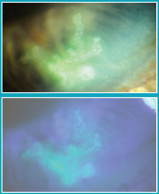 Dr. Holland: A dendritic lesion may enlarge, becoming a geographic ulcer, also with active virus in the swollen borders. We see dendritic and geographic lesions in both the conjunctiva and the cornea, so it's something to check for in the conjunctiva when patients have recurrent conjunctivitis.