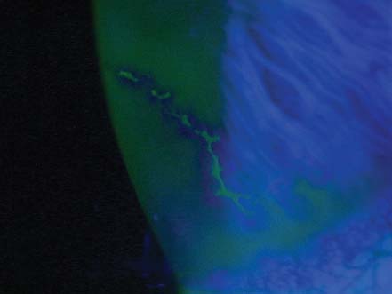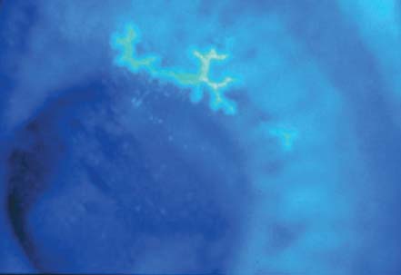 Figure 2. The patient had a mid-peripheral dendritic lesion. The classic dendritic fluorescein stain is a true ulcer; the entire lesion stains with fluorescein, and often the borders will stain with rose bengal.
