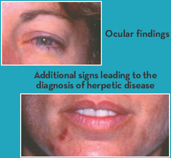 Dr. Pepose: Let's evaluate the case of a 27-year-old woman who presented with a 4-day history of a nonproductive cough and spiking fever, accompanied by a 2-day history of a red left eye with lid swelling, epiphora and decreased vision. She had crusting right-sided skin lesions consistent with resolving herpes labialis (Figure 1).