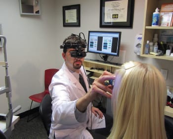 Dr. Dan Kiernan performs indirect ophthalmoscopy in an examination lane. Electronic medical records and digitalization of all imaging, including SD-OCT, facilitates follow-up.