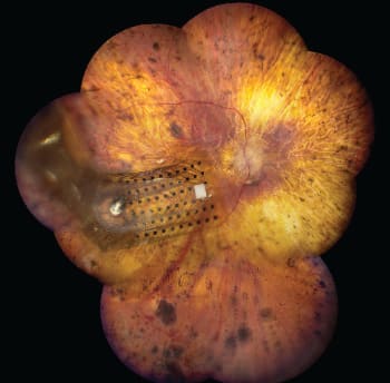 Figure 4. The Retina Implant AG in place. FROM ZRENNER E, ET AL. SUBRETINAL ELECTRONIC CHIPS ALLOW BLIND PATIENTS TO READ LETTERS AND COMBINE THEM TO WORDS. PROC. R. SOC. B. BIOL. SCI. PUBLISHED ONLINE 3 NOVEMBER 2010. REPRINTED WITH PERMISSION OF ROYAL SOCIETY PUBLISHING.