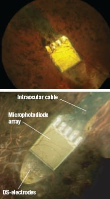 Zrenner et al. at Tübingen University have continued to develop a subretinal prosthesis called the Retina Implant AG, which consists of a microphotodiode array (Figure 4) powered by either a laser or telemetry for the replacement of degenerated photoreceptors in outer retinopathies.18,21,22