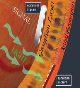 Similar in many ways to the placement of the cochlear implants, the flexible retinal electrode array can be placed on the retinal surface, on the subretinal space and even in the suprachoroidal space (Figure 1). The device is comprised of an electrode array, a cable and an external processing device. The photons can be captured either by a camera mounted in glasses or inside the eye or with the use of an implanted microphotodiode.