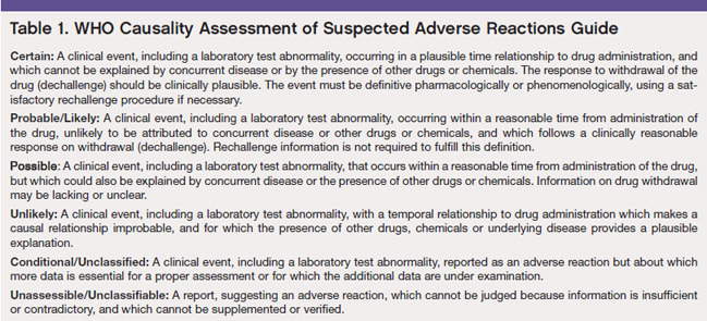What follows are a few representative drugs that most ophthalmologists should be aware of in their clinical practices. Where data is available, adverse ocular effects are classified according to the World Health Organization's Causality Assessment of Suspected Adverse Reactions Guide. This template helps categorize medications into side effect profiles. The definitions can be found in Table 1 (below).