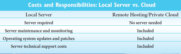 The advantages of local servers are simple. You have physical control over your server. You can put your hands on it and know that your data is safe, and you can have any necessary upgrades made as well. If your practice is in a rural area where high-speed Internet access is not available, then local hosting is a better option than the Internet-based cloud.