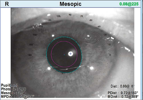 Pupil size. The OPD-Scan III displays mesopic and photopic pupil sizes, both of which are key when choosing a multifocal IOL. When I compare the enlarged pupil in dim illumination versus the contracted pupil in bright light, I know if I need a pupil-dependent multifocal lens such as the AcrySof IQ Restor (Alcon) or a non-pupil dependent lens like the Tecnis (AMO)—the Tecnis being more advantageous in low light situations.