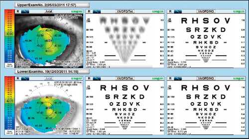 Figure 2. This side-by-side comparison shows the axial map and visual acuity before and after implantation of a toric IOL.
