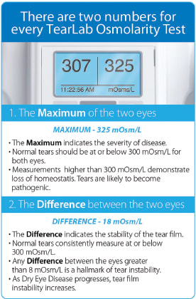 Tear osmolarity should be taken two hours after the instillation of any eye drops, which could result in a falsely low osmolarity reading, and could be disturbing the ocular surface and creating reflex tearing when performing the test. Elevated tear osmolarity readings are strongly indicative of dry eye disease and in my experience, false positive results are rare. Repeatedly normal osmolarity with inter-eye variation of less than 8 mOsm/L should prompt a search for other root causes of symptoms, such as allergy or conjunctivochalasia. Tear osmolarity is an important component in the diagnosis of dry eye, but is not a substitute for a careful history, review of medications, examination of the eyelids and ocular surface, and performance of other dry eye tests. Hyperosmolar tears, while consistent and necessary for the diagnosis of dry eye disease and highly correlated to disease severity, do not differentiate between aqueous deficient versus evaporative or mixed disease,3 and additional signs should be evaluated to aid in this distinction.