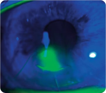Figure 3. Ulceration of epithelium staining with fluorescein sodium and deep, suppuration involving astigmatic keratotomy incision.