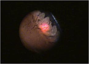 Figure. Endoscopic view of ciliary processes shows the aiming beam of the laser (red light) on the location of treatment. This patient has plateau iris configuration in which the ciliary processes are prominent anteriorly.