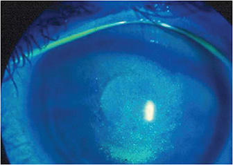 This patient also has filaments, which need to be debrided and cleaned. If this is an evolving and severe filamentary keratopathy, I would then follow an aggressive step ladder approach to prevent surface damage and alleviate the severe ocular pain associated with this condition. I like to use bandage contact lenses for these patients to provide some comfort until I can stabilize the ocular surface. These patients must be followed closely, because if this is an autoimmune-mediated dry eye, the cornea can melt rapidly.