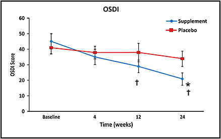 Symptoms: Mean OSDI scores progressively improved with supplement use, achieving significance at 12 weeks and 24 weeks (P = 0.004), and were significantly improved vs. placebo at 24 weeks (P = 0.05) (Figure 1).