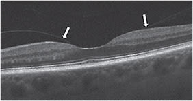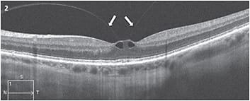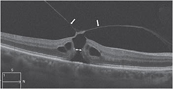 Figure 2: OCT shows focal VMT with intraretinal cysts; arrows highlight the posterior vitreous cortex.