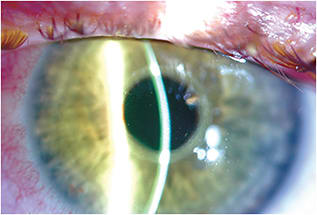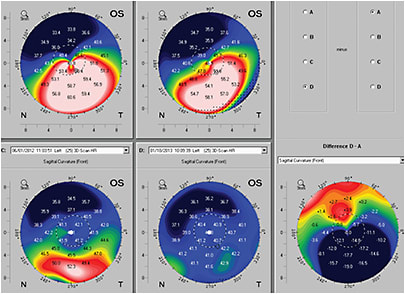 RC, a 52-year-old man, presented with a history of corneal ectasia in his left eye, status post LASIK eight years earlier. Visual acuity in the unaffected right eye was 20/30 uncorrected and improved to 20/20 with -1.00 D sphere. Visual acuity in the left eye, however was 20/200 uncorrected and was best corrected to 20/80 with -2.50 -5.00 x 105. The patient complained of diplopia in his left eye. Corneal topography showed a maximum keratometry reading of 60.60 D.