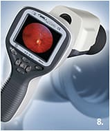 8. This handheld imager offers high-resolution images of both the posterior and anterior segments. These images can be captured off-site, for instance, in clinics or in fieldwork. The images can be uploaded to a computer via Wi-Fi and, the company says, are compatible with most imaging software programs. The retinal module provides a 40° field of view of the fundus. The anterior module uses a series of cobalt blue LEDs for fluorescent imaging.