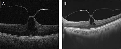 Figure 3. Vitreomacular traction as viewed with SD-OCT (A) and Atlantis SS-OCT (B). Swept source shows a wider view from the optic nerve to the peripheral macula, along with vitreous adhesion to the optic nerve and a single strand of vitreous traction to the mid-peripheral macula.