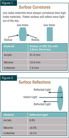 The second reason the nanoFLEX is the IOL I prefer for cataract surgery patients who have previously had corneal refractive surgery is that I can use the WaveScan WaveFront System (Abbott Medical Optics) to obtain a useful wavefront measurement with this lens in the eye. I can then perform a wavefront-guided surface ablation to correct residual refractive error, i.e., “refractive surprises.” (Note that this is an off-label procedure.) The ability to obtain a usable WaveScan through a nanoFLEX lens relates to the optical properties of the Collamer material. The hydrophilic nature of Collamer gives the IOL an ultra-high water content (40%) and a relatively low index of refraction. Thus, to achieve the desired IOL power the curvature is steeper than that of most other IOLs (Figure 1). Therefore, the amount of light reflected off the front surface is much less than with other IOLs (Figure 2). Obtaining a usable WaveScan through acrylic IOLs isn’t possible because the reflected light creates a large “blob” of reflected light in the center of the scan that prevents the system from calculating a treatment.