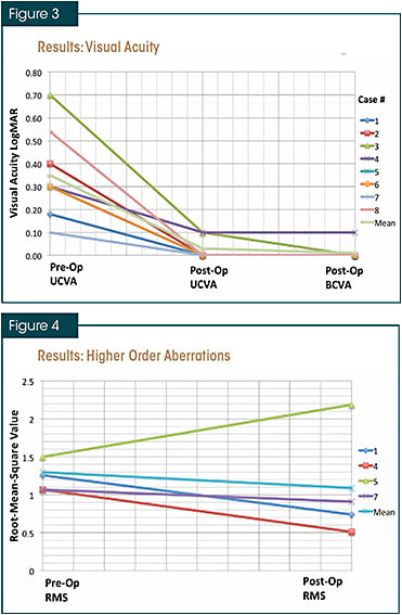Figures 3 and 4. In eight eyes of five patients who underwent off-label wavefront-guided PRK with iris registration to correct residual refractive error following cataract surgery, UCVA improved, BCVA improved or remained the same, and mean higher-order aberrations measured by RMS error decreased. All of the patients had corneal refractive surgery at some point prior to cataract surgery.
