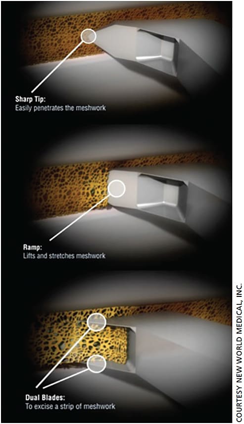 The Kahook Dual Blade, FDA approved in fall 2015, excises TM tissue by using precision micro-machining and laser-cutting technology. A key feature is its ramp that stretches the TM as the device advances, aiding in the meshwork’s clean excision. (Figure 3).