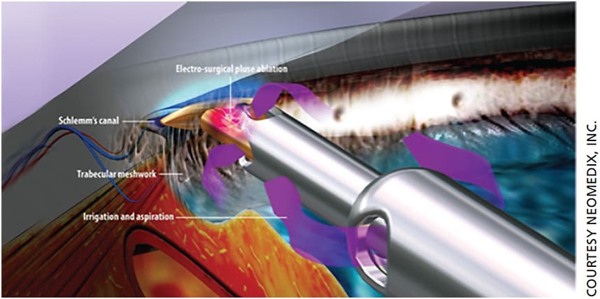 Trabectome, available commercially in 2006, was the first MIGS procedure.4 Though incisions into the canal (goniotomies and trabeculotomies) have been performed for decades, the Trabectome device provides a unique ab-interno approach to the angle through a temporal clear corneal incision.5 The device’s features include electroablation and aspiration of debris under a protective foot plate to prevent damage to the scleral wall and collector channel ostia (Figure 1).