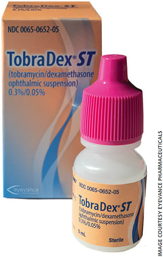 Tobradex ST is a change from the original formulation Tobradex, as it has a decreased amount of steroid — from 0.1% to 0.05% — in addition to the added xanthan gum, an inactive agent that allows for increased contact time.2 Scoper et al found that the higher viscosity of Tobradex leads to increased retention time and improved bactericidal activity.3