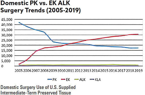 Similar to the greater adoption of DSAEK techniques that resulted from the availability of pre-cut DSAEK tissue, the availability of customized pre-cut DMEK tissue has placed DMEK at the forefront of growth in endothelial transplantation. Again, 64% of all corneal transplants in the U.S. were EK, with a 23% increase in DMEK.1
