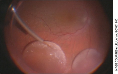 Subretinal delivery is the most common method of delivering gene therapy. Subretinal injections have existed for decades7 and are ideal in gene therapy because they deliver the vector directly adjacent to the photoreceptors and retinal pigment epithelium (RPE), which are commonly dysfunctional in inherited retinal diseases. The technique involves first performing a complete vitrectomy then utilizing a 41-G cannula to access the subretinal space through the retina (Figure). While this is an advanced surgical technique, many retina surgeons should be able to perform it after some training.