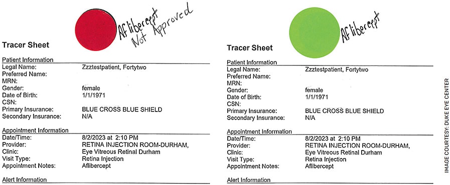 At Duke Eye Center, ensuring that authorizations are completed prior to procedures is everyone’s responsibility. Doctors are very visual, so we have created a system of color-coded dots that we place on a tracing form that follows patients during their visits (Figure). The system allows clinicians to see at a glance if a patient is approved for several medications, one treatment or none at all — which, in turn, signals the need to consult a financial counselor or insurer.