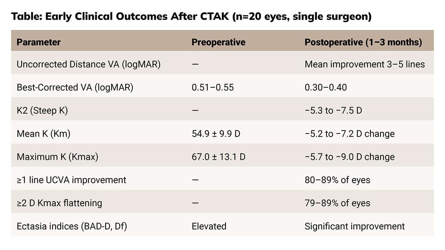 In a prospective trial of CTAK, at 6 months, mean UDVA improved from ~20/327 to ~20/82 and CDVA from ~20/82 to ~20/43, with most eyes gaining ≥2 lines of UDVA and more than half gaining ≥2 lines of CDVA. Mean keratometry flattened by ~8 D, refractive error shifted toward plano, and no eyes lost UDVA, demonstrating meaningful early improvements in both vision and corneal shape.2