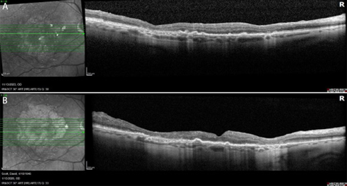 Throughout more than 2 years of treatment OD and 9 months OS, VA has remained stable at 20/40 bilaterally. FAF imaging at approximately 2 years demonstrates continued GA enlargement OD, though with preservation of a central foveal island (Figure 2b). OCT confirms stable foveal architecture despite peripheral atrophic progression (Figure 3). No adverse events have been observed, and the patient continues his active lifestyle.