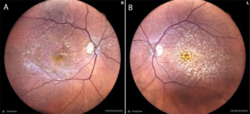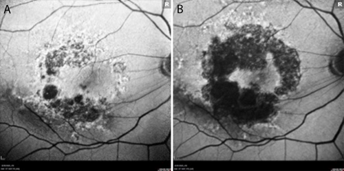 At baseline, best-corrected visual acuity (BCVA) was 20/40 in each eye. Color fundus photography (Figure 1) and fundus autofluorescence (FAF) imaging (Figure 2) revealed bilateral geographic atrophy (GA) secondary to dry age-related macular degeneration (AMD). The right eye demonstrated a moderate multifocal nonsubfoveal GA with hyperautofluorescent borders, a hallmark of active progression. The left eye showed large and numerous central drusen with pigmentary changes and only very mild atrophy. No choroidal neovascularization was present in either eye.