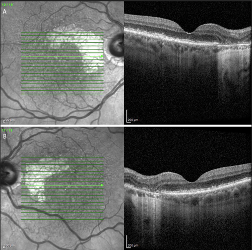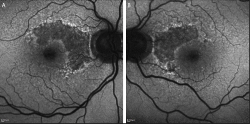 A comprehensive ocular examination including slit-lamp and dilated fundus examinations along with multimodal imaging including optical coherence tomography (OCT) and fundus autofluorescence (Figures 1 and 2) was performed. Snellen visual acuity was 20/25 in the right eye and 20/25 in the left eye. Slit-lamp examination was significant for posterior chamber intraocular lenses. Dilated fundus examination revealed bilateral nearly symmetric areas of geographic atrophy sparing the central fovea. There was no evidence of choroidal neovascularization.