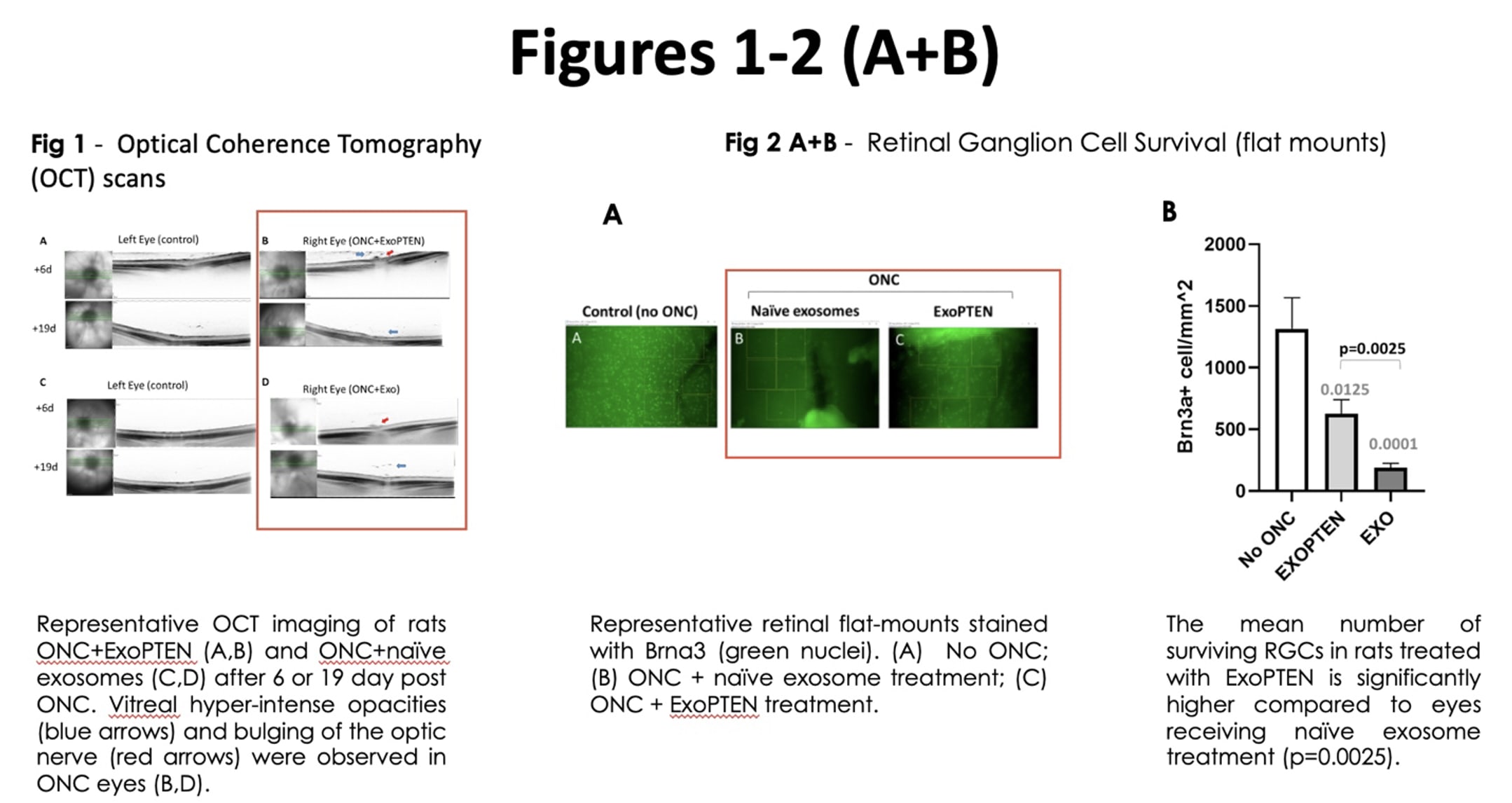 The study also showed that ExoPTEN treatment significantly enhanced the survival of retinal ganglion cells — key neurons responsible for transmitting visual information to the brain. Detailed analysis of retinal flat-mounts confirmed this effect, with treated eyes exhibiting substantially higher counts of these cells compared to untreated or control-treated eyes (Figures 2A and 2B).