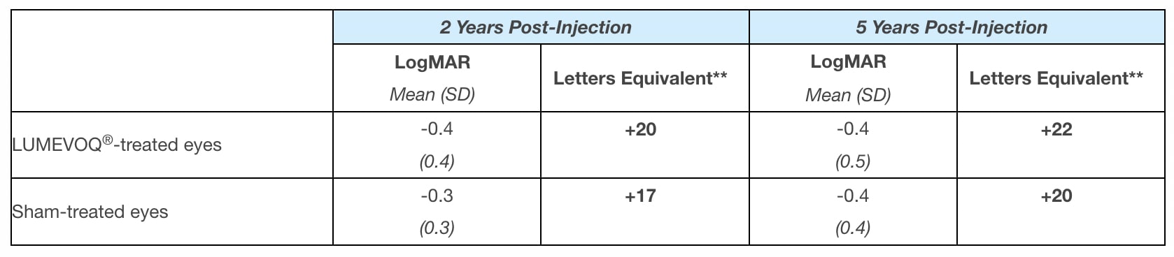 The impact of such results on patients is demonstrated by increases in the self-reported quality of life scores at Year 5 vs baseline, the company noted. Clinically significant improvement from baseline was observed in 7 of 10 subscale scores of the NEI VFQ-25 questionnaire used to assess quality of life. The composite score showed a clinically meaningful gain of 7 points from baseline.