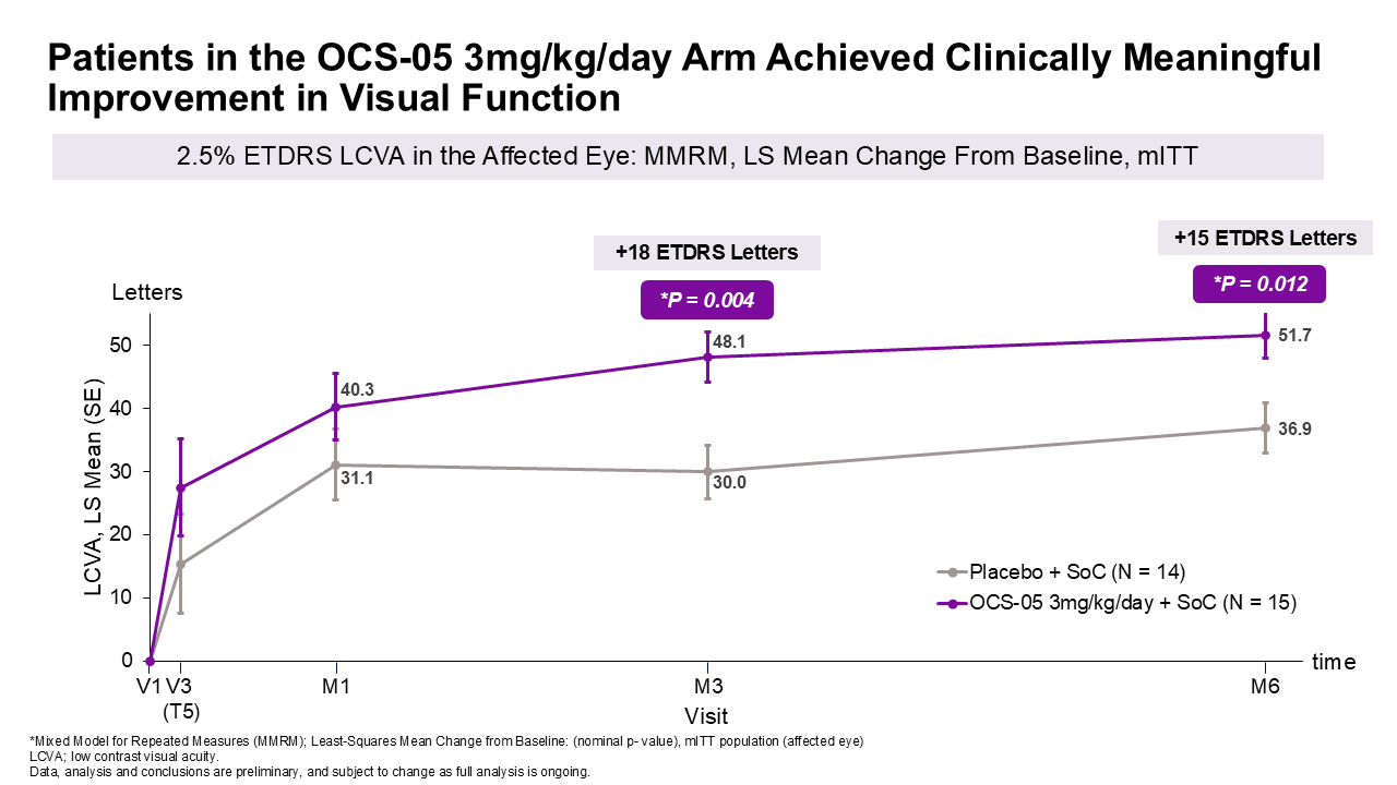 - A favorable difference in LCVA mean change from baseline of approximately 18 letters at month 3 and approximately 15 letters at month 6 with OCS-05 (3 mg/kg/day) + steroid compared to placebo + steroid, with p-values^ of 0.004 and 0.012 at 3 and 6 months, respectively.
