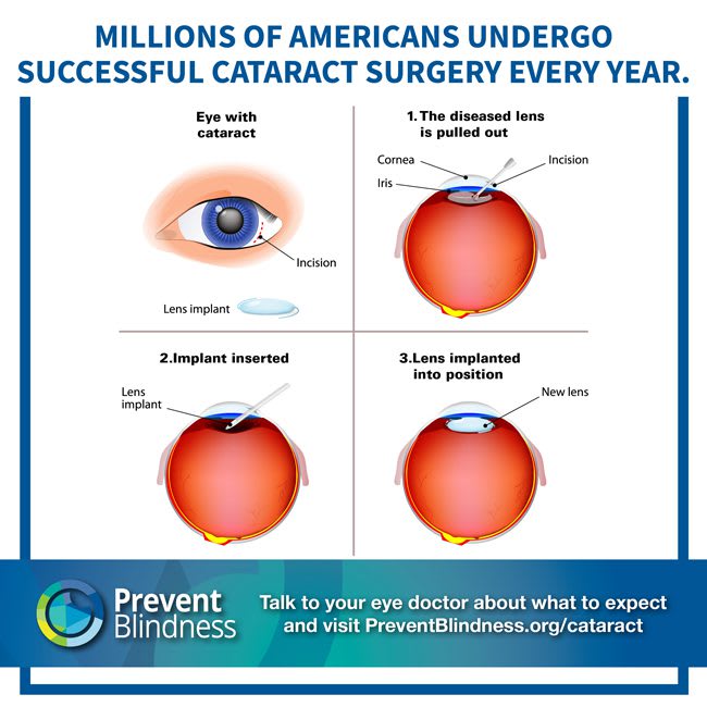 The American Academy of Ophthalmology states that during cataract surgery, an eye surgeon will remove the eye’s cloudy natural lens. Then, he or she will replace it with an artificial lens. This new lens is called an intraocular lens (IOL). For those who have had cataract surgery recommended by their eye doctors, Prevent Blindness offers the dedicated webpage, PreventBlindness.org/cataract-surgery, and the printable “Guide to Cataract Surgery.”