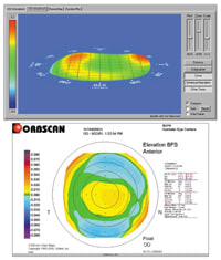 One of the first decisions you'll have to make, Dr. Durrie said, is whether to switch lasers if you're not already using Alcon's LADARVision. "Also, you should be determining who in your patient base is a good candidate for a custom ablation and who can have a traditional treatment," he said. (See images below.) "For quite some time, in addition to the eye-health exam, I've been performing what I call an "advanced vision analysis" on all of my patients who are interested in refractive surgery. I combine information from the Orbscan and aberrometry to determine whether a symmetrical treatment will fit well on a certain eye, or whether it would leave the patient with residual higher-order aberrations that would degrade the quality of his vision enough that he should wait for a custom ablation.