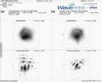 Getting post-surgery feedback. Dr. Hardten also uses wavefront data to help him decide the best way to improve a patient's vision after treatment. For example, one of Dr. Hardten's patients had a post-LASIK manifest refraction of -0.5, +0.5 x 110 OD; he was 20/20 uncorrected, 20/20 best corrected. However, the patient's "wavefront refraction" showed sphere and cylinder of -0.29, -0.27, axis 23, and that 73% of the problems with his post-op vision were higher-order aberrations, mostly in the form of coma, with a little trefoil.