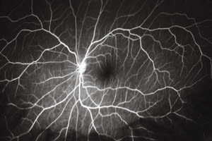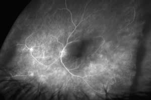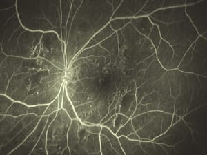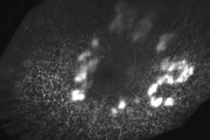 Optomap fluorescein angiogram showing extensive leakage near the optic disc. |