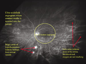 Ultra widefield view shows the retinal periphery, making it possible to see pathology not imaged by fundus cameras.