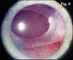 The most common late indication for IOL removal (and replacement) is symptomatic malposition,1 such as decentration (Figure 2), subluxation (Figure 3), or total dislocation (Figure 4). IOL malposition can be the result of asymmetric fibrotic contracture of the capsule, an eccentric capsulorrhexis (Figure 5), asymmetric IOL placement with one haptic in the bag and one in the sulcus, following Nd:YAG laser posterior capsulotomy, or the result of trauma. With the increasing use of presbyopic IOLs, IOL position is even more critical. Multifocal IOLs with only minor decentration can be symptomatic requiring removal. An accommodative IOL, particularly the one plate-haptic model (crystalens, eyeonics, Aliso Viejo, Calif.) has demonstrated a unique positional malfunction wherein capsular contraction can cause long-axis compression with asymmetric folding at the haptic-optic junction. This results in optic tilting with up to 3.0 D of pseudophakic astigmatism (Figure 6). This unique constellation has been called Z-syndrome due to the shape of the distorted IOL and can necessitate IOL removal. If the surgeon finds at the time of explantation that the IOL is fixed in the capsular fornices, haptic amputation may be necessary with removal of the optic only.
