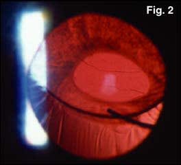 Figure 9. Scleral suture fixation of dislocated capsule/IOL/CTR complex.