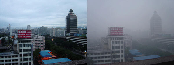 Figure. The difference between this scene from Beijing, China, on a sunny day after several days of rain (left) and the same scene on a normal sunny day provides a visible example of the effect weather patterns can have on pollution and air quality.