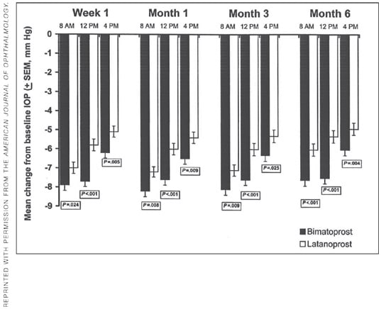 Noecker and colleagues49 found similar results in a 6-month prospective, multicenter, randomized, investigator-masked trial in 269 patients. Treatment q.i.d. with bimatoprost 0.03% was more effective than latanoprost 0.005% in lowering IOP. The mean reductions were statistically significantly lower with bimatoprost than latanoprost at all measurements (8 a.m., 12 p.m. and 4 p.m.) on all four follow-up visits (1 week and 1, 3 and 6 months) (P values ranging from <.001 - .049) (Figure 3). At 6 months, the reduction vs. baseline was 1.5 mm Hg greater at 8 a.m. (P<.001), 2.2 mm Hg greater at 12 p.m. (P<.001), and 1.2 mm Hg greater at 4 p.m. (P=.004) for bimatoprost vs.latanoprost. The percentage of patients achieving a >20% IOP decrease was 69% to 82% with bimatoprost and 50% to 62% with latanoprost (P<.003). Both drugs were well tolerated.
