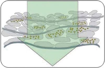 Selective laser trabeculoplasty (SLT) uses a 532 nm Q-switched, frequency-doubled Nd: YAG laser to emit short pulses that target pigmented melanin cells. The ability to burn the TM selectively means that SLT can precipitate the biological and chemical mechanisms needed to improve aqueous outflow, but without damaging adjacent, non-pigmented cells (Figures 2 and 3). Like ALT, SLT is applied over approximately 50 spots at 180°, but SLT has a larger beam diameter, so it treats a larger area of the TM (approximately 400 μm) and eliminates the need for fine focusing (Figure 4).