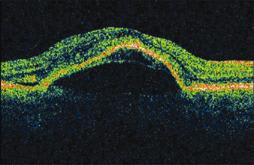 I found the test to be reliable based on indices of false negative and false positive results. After a follow-up OCT confirmed the presence of a pigment epithelial detachment (PED) (Figure 2), I discussed with the patient treatment versus observation. Since PEDs are unpredictable and may be stable for a long time, we elected to watch for now. Upon her return visit after 1 month, her vision had dropped from 20/40 to 20/80 and repeat OCT revealed a larger PED (Figure 3). At that time we instituted Lucentis for the right eye as well. Thus far, she has had a total of seven Lucentis injections, two pegaptanib (Macugen, OSI Pharmaceuticals) injections, one PDT, and two Avastin (Genentech) injections. As of July 2008, the date of her last injection, her vision was stable at 20/60. I believe the information generated by the Foresee PHP saved her sight by picking up her lesion much earlier, allowing me to treat promptly.